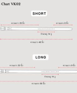 – Shot 46 นิ้ว 14 รู (สั้น) วัดจากหัวเข็มขัดถึงปลายเส้น(หัวเข็มขัดถึงรูแรก 25 นิ้ว รูสุดท้ายถึงปลายสายเหลือ 8 นิ้ว)